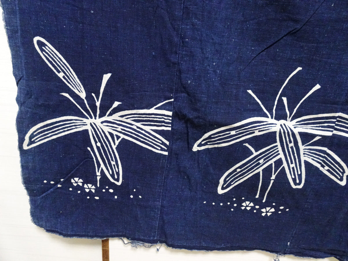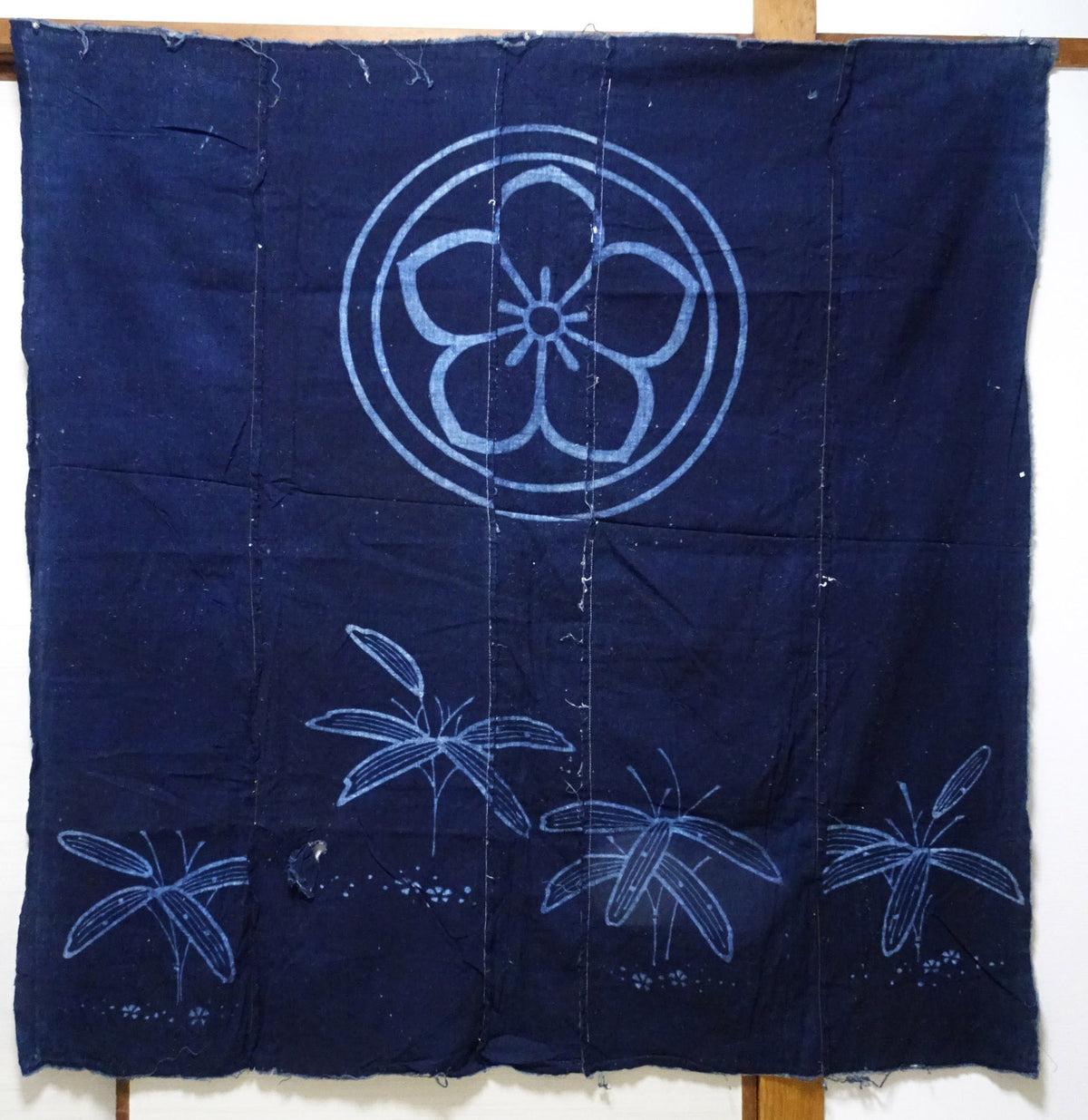 This striking piece features a bold tsutsugaki (freehand resist-dye) design on deep indigo-dyed cloth. The hand-drawn lines of the large floral family crest at the top, paired with the graceful grass motifs across the bottom, create a harmonious balance of strength and elegance unique to traditional Japanese folk textiles.