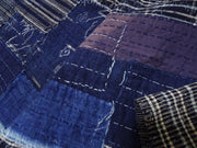 Multiple shades of deep Japanese indigo overlap beautifully, and the visible hand-sewn stitches give the piece a warm, organic character. Each patch carries its own history, coming together to form a visually striking composition reminiscent of abstract art.