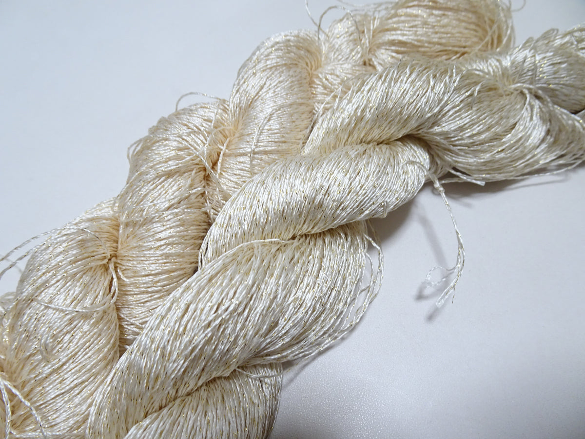 These silk thread is threads made in Kyoto NISHIJIN.This thread is a twist of silk thread and gold leaf thread.These silk threads are hand-dyed with natural dyes.
