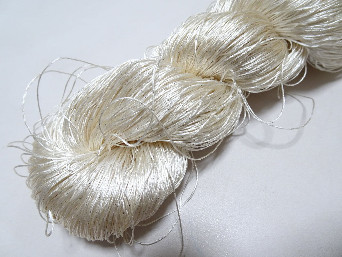 These silk thread is threads made in Kyoto NISHIJIN.This thread is a twist of silk thread and gold leaf thread.These silk threads are hand-dyed with natural dyes.