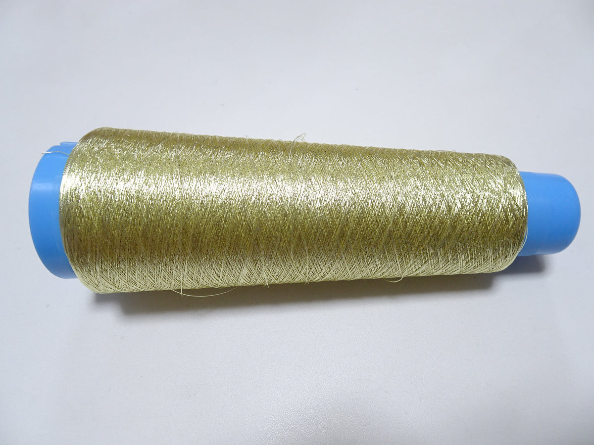 This thread has become in three layers. the core of the thread is rayon. Surface has deposited the sterling silver to gold. Sterling silver covers ring in the polyester film.