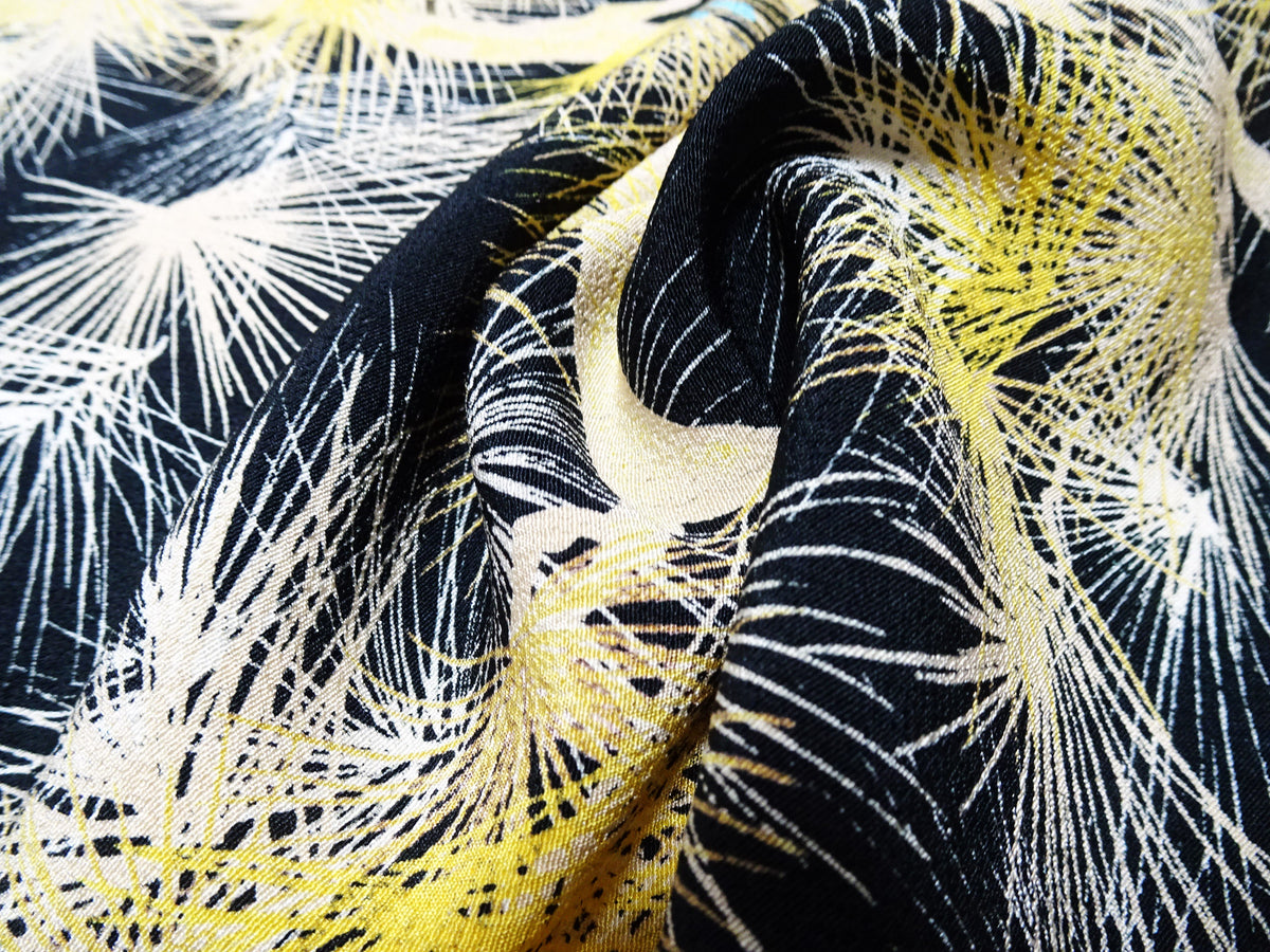 Set against a deep black ground, the design depicts an elegant and highly unusual pine tree motif.