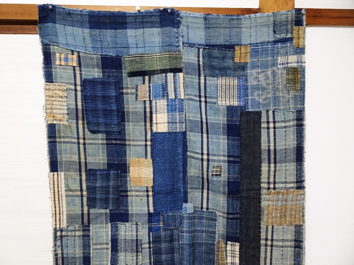 This piece features calm indigo tones characteristic of Tamba-fu, combined with carefully hand-stitched patches added over time for practical use.