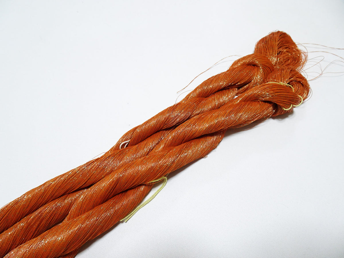 This thread is made by painting lacquer on Japanese paper and wrapping it around the core.Extremely fine gold leaf particles are glued to the surface.