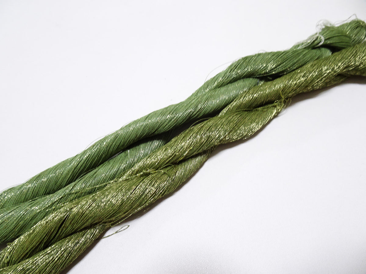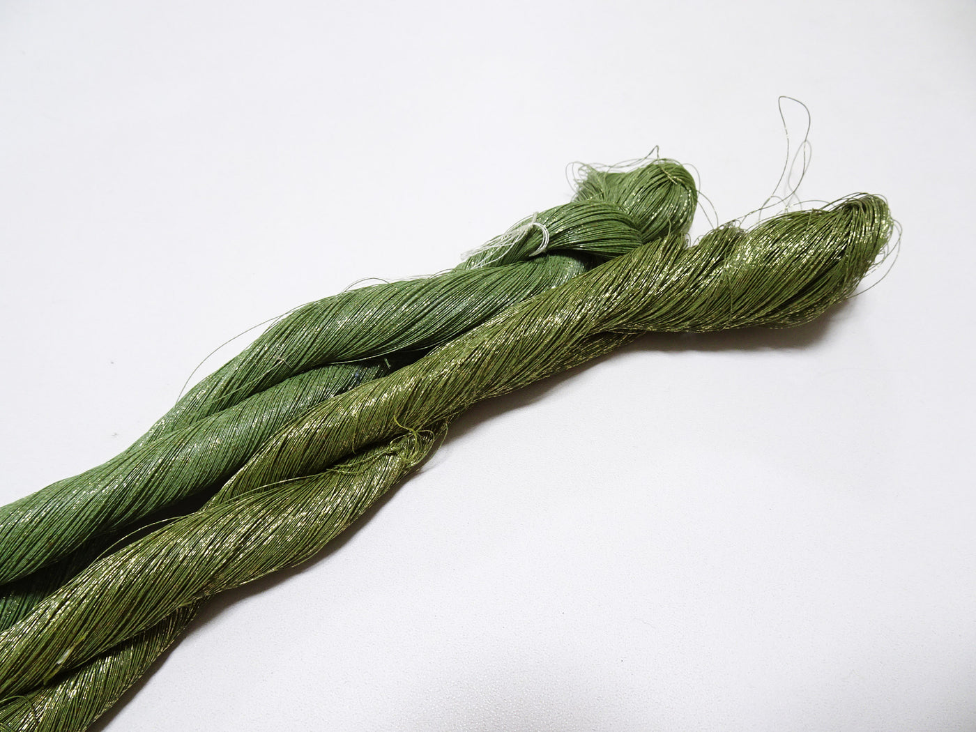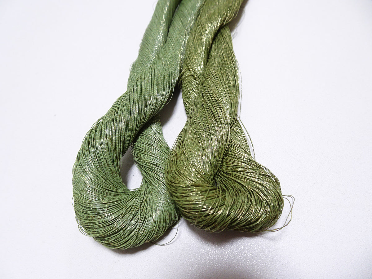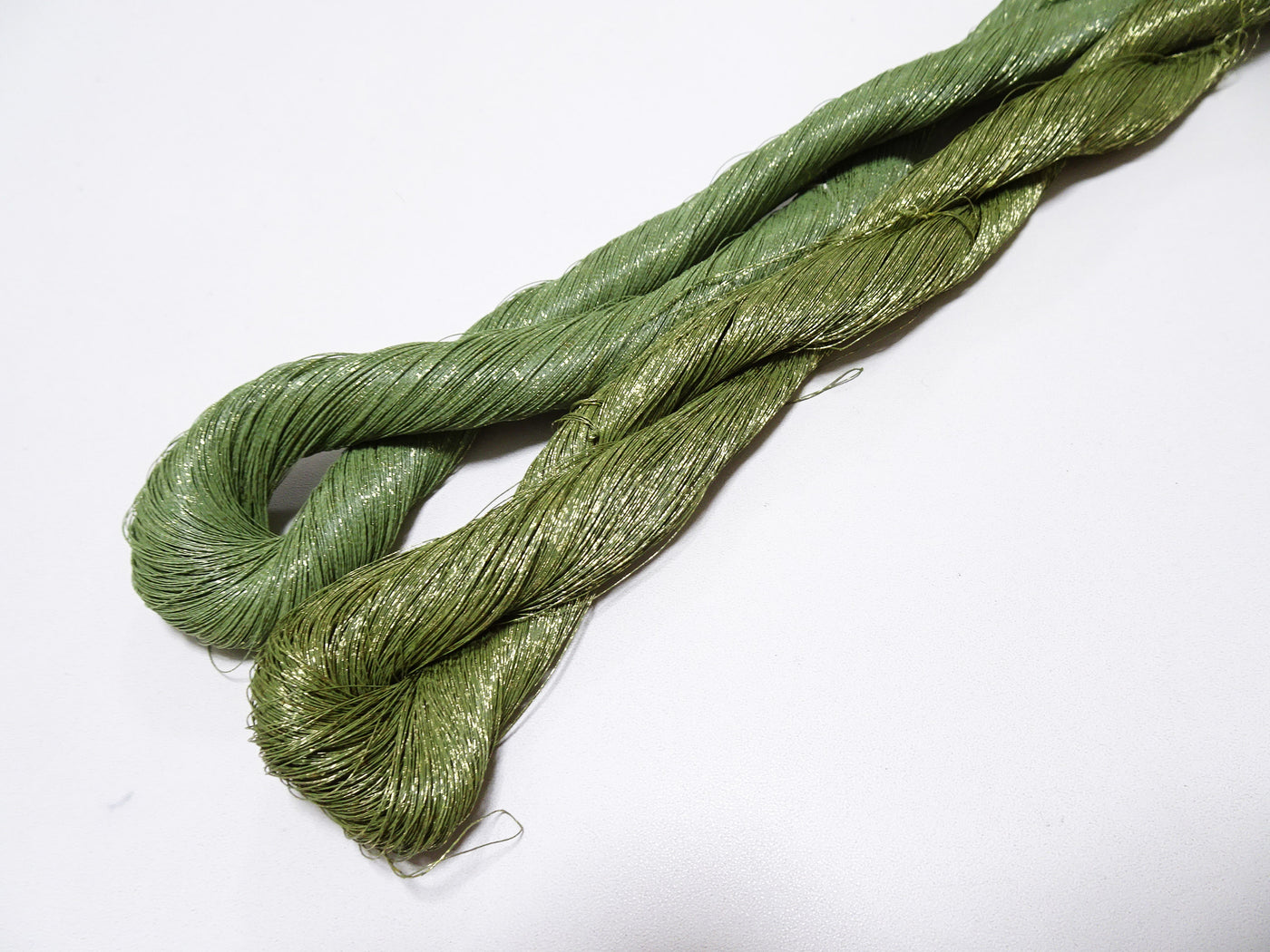 This thread is made by painting lacquer on Japanese paper and wrapping it around the core.Extremely fine gold leaf particles are glued to the surface.