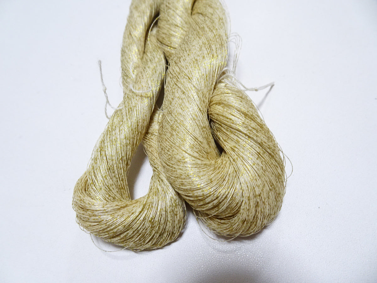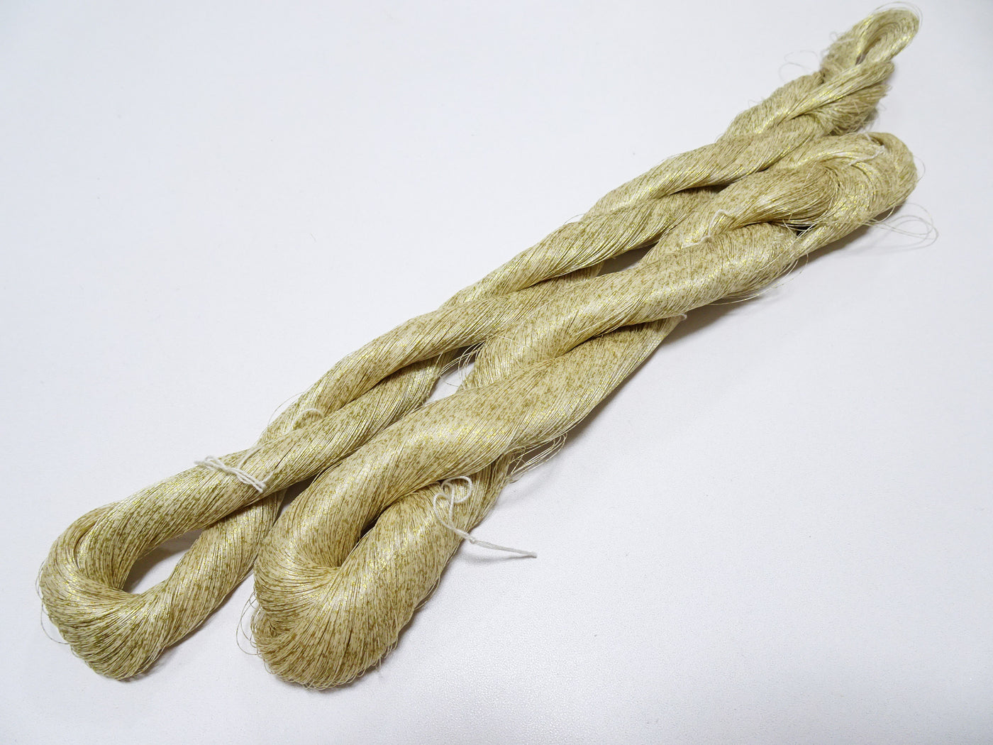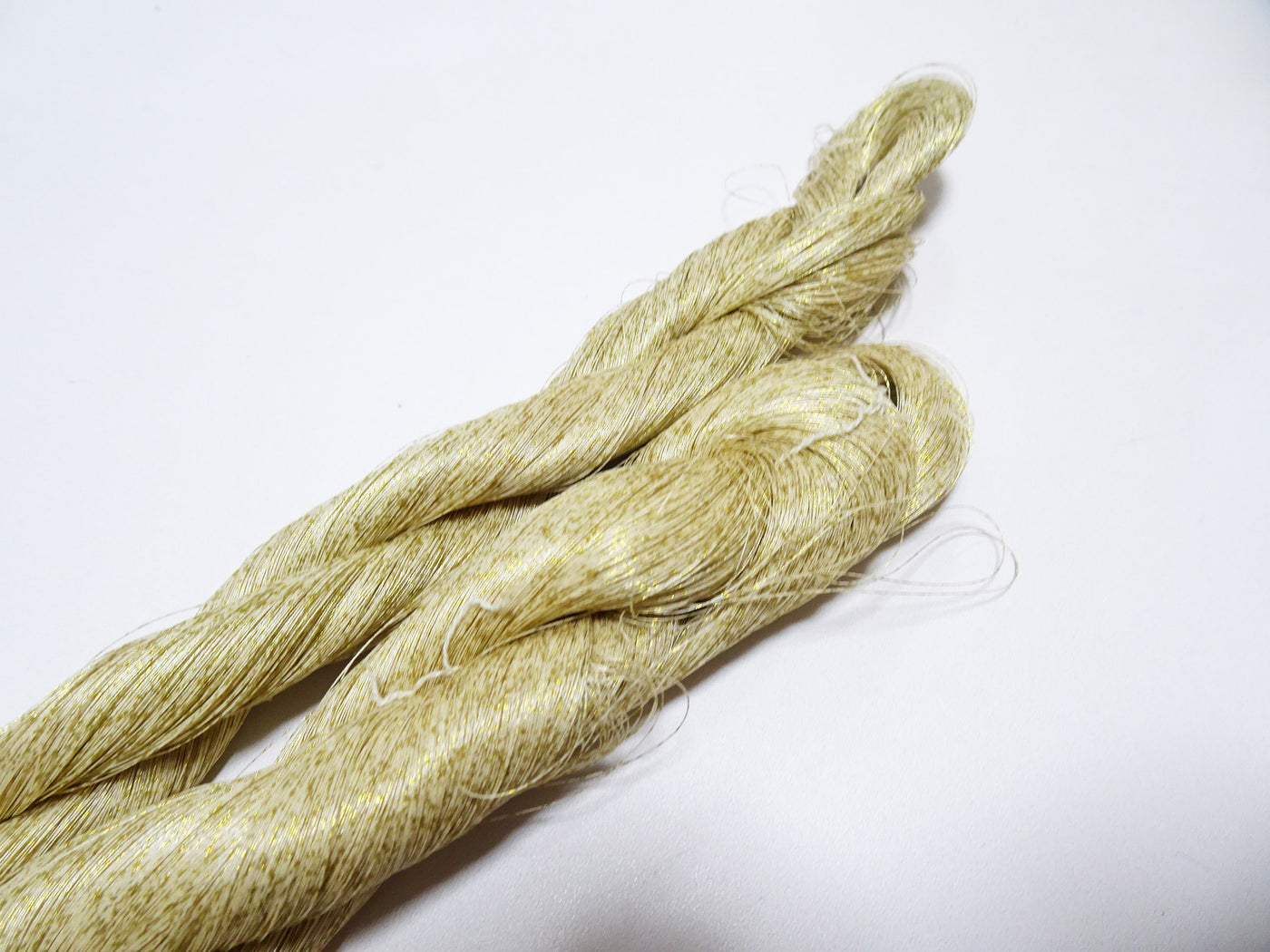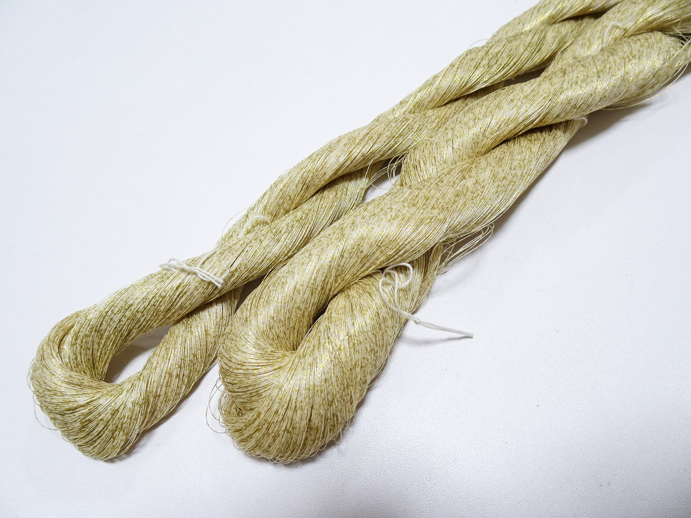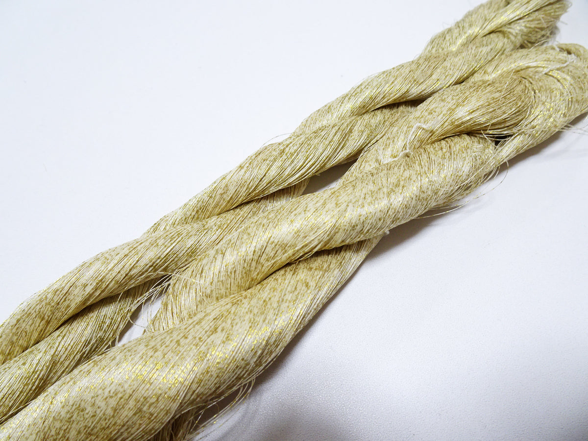 This thread is made by painting lacquer on Japanese paper and wrapping it around the core.Extremely fine gold leaf particles are glued to the surface.